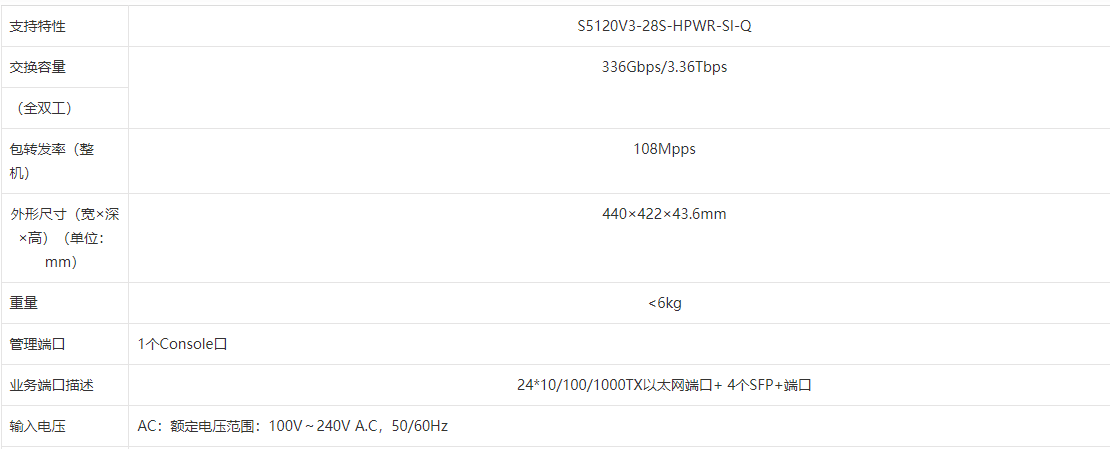 H3C S5120V3-28S-HPWR-SI-Q以太网交换机提供10/100/1000Base-T自适应以太网端口、10G SFP+上行光口。在企业网中,可以作为接入设备