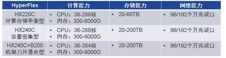 HyperFlex有三款型号,所有的型号都包含“网络、计算、存储”资源和能力: