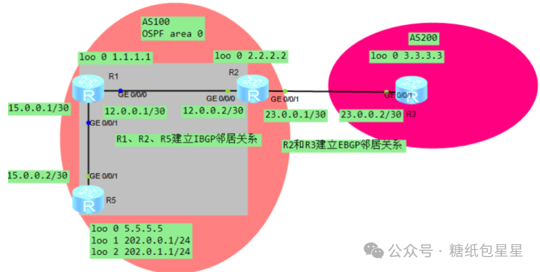 1、配置好各路由器的IP地址以及回环地址,此步骤略